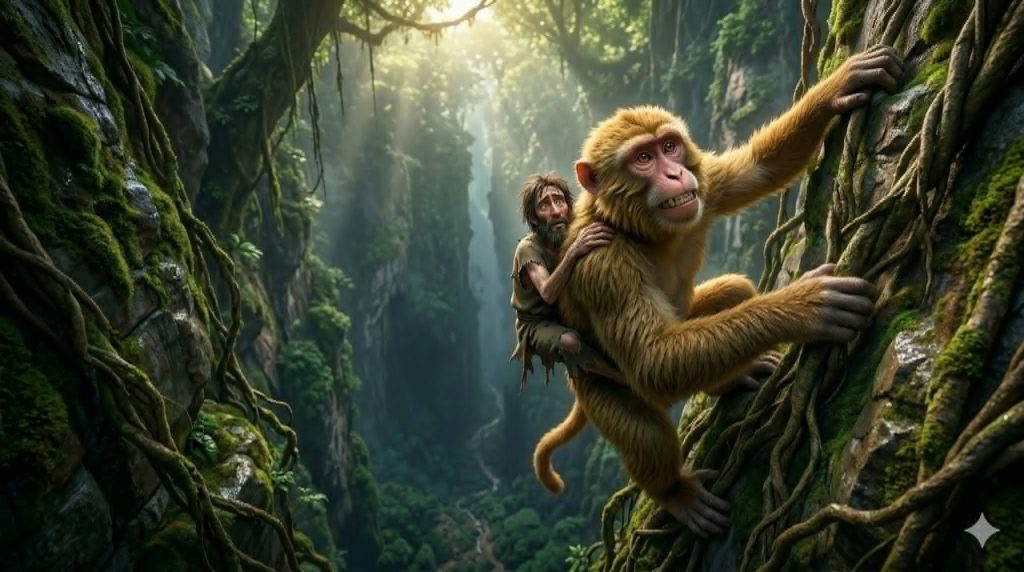 Una vez que el hombre está a salvo, el mono le indica el camino de regreso y le da este último consejo: «Vuelve con los tuyos y, sobre todo, no cometas más malas acciones». Agotado, el mono se queda dormido. Es entonces cuando el hombre, poseído por un impulso —el hambre—, toma una piedra y golpea violentamente la cabeza de su salvador.